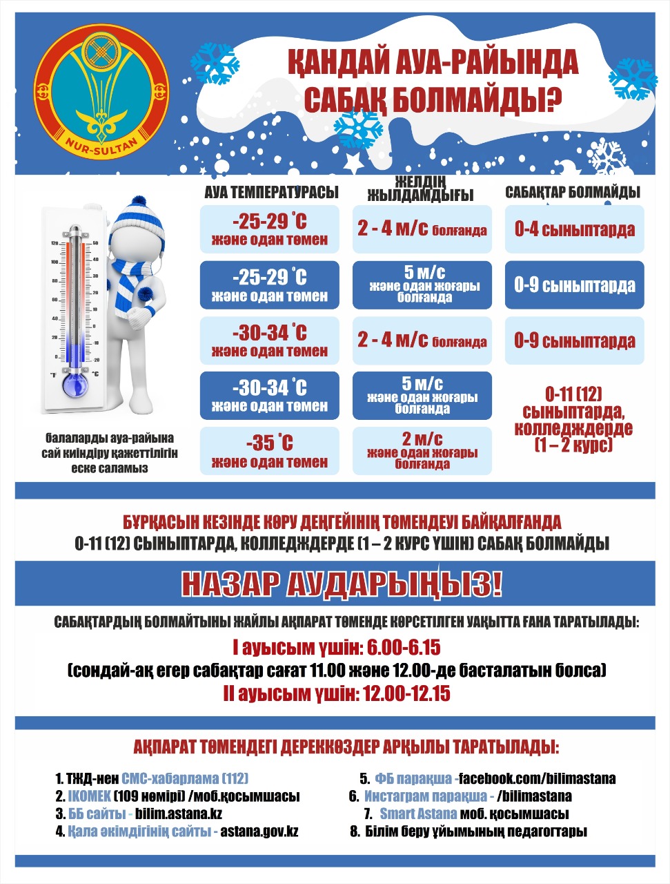 Ежедневно в 6.00 часов утра для первой смены (для второй смены в 12.00 часов дня) ответственный сотрудник связывается с дежурным РГП на ПВХ «Казгидромет», чтобы получить данные по фактическому значению температуры (прогноз) в городе Нур-Султан на ближайшие три часа. Полученные данные согласуются с руководством, которое принимает решение по объявлению отмены занятий или организации учебного процесса без изменений.