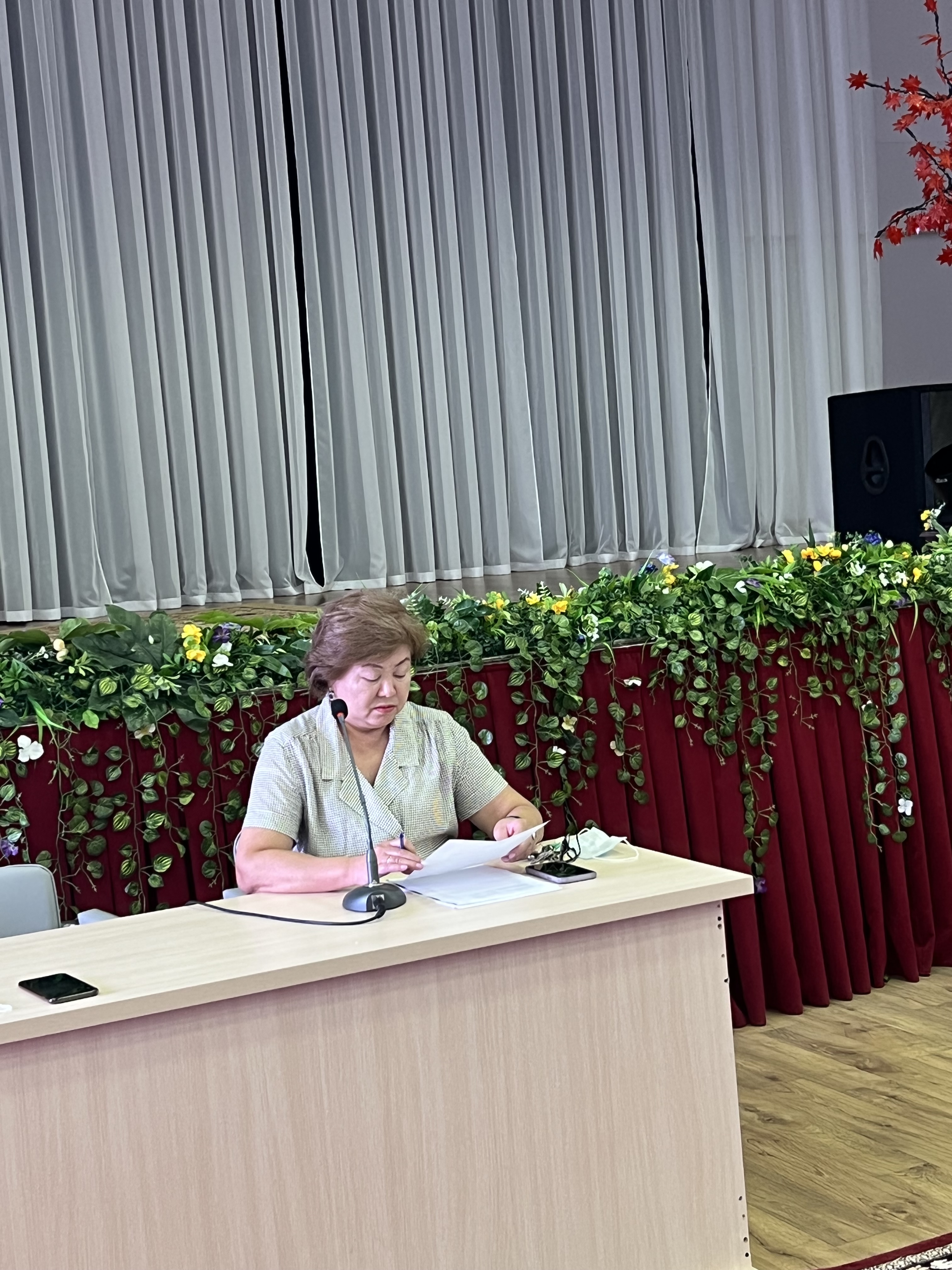 Поприветствовала педагогический коллектив директор школы Құлмағанбетова Зәмзәгүл Рыспайқызы. Зәмзәгүл Рыспайқызы отметила: «На наших педагогов возложена огромная ответственность, ведь именно от качества образования зависит какое вырастит поколение, и какое мировоззрение будет сформировано у наших юных граждан. Хочется пожелать всем нам успешного учебного года, новых педагогических побед, творческих открытий и, конечно, талантливых способных учеников! После приветствия директор предоставила слово членам администрации. В своих докладах заместители затронули все аспекты жизни образовательной системы школы в 2024-25 году: какие мероприятия были проведены, каких успехов добились наши ученики и их педагоги, затронули вопрос качества знаний/ успеваемости и информатизации и многое другое. Также были озвучены изменения внесенные в ИМП на 2025-2026 учебный год. С поздравительным словом и напуственными словамти перед коллективом выступила представитель ДКСО. И в заключении перед педагогами были поставлены приоритетные направления, цели и задачи.